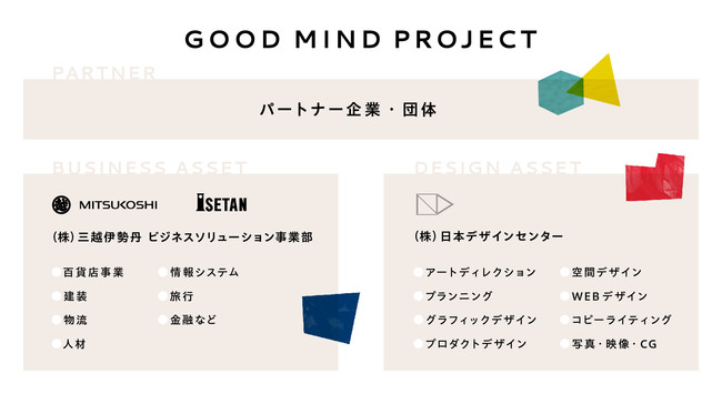 上場企業など1,000以上の法人顧客を持つ、株式会社三越伊勢丹(本社:東京都新宿区、代表取締役社長執行役員 細谷 敏幸)ビジネスソリューション事業部(以下BS事業部)と、1959年創業のデザイン制作会社である株式会社日本デザインセンター(東京都中央区銀座4丁目・代表取締役社長 原研哉、以下NDC)は、ビジネス構想力とデザイン・企画力の、融合と高度化を通じて、さまざまな企業の課題解決をめざした協業事業「GOOD MIND PROJECT(グッドマインドプロジェクト)」を展開していきます。