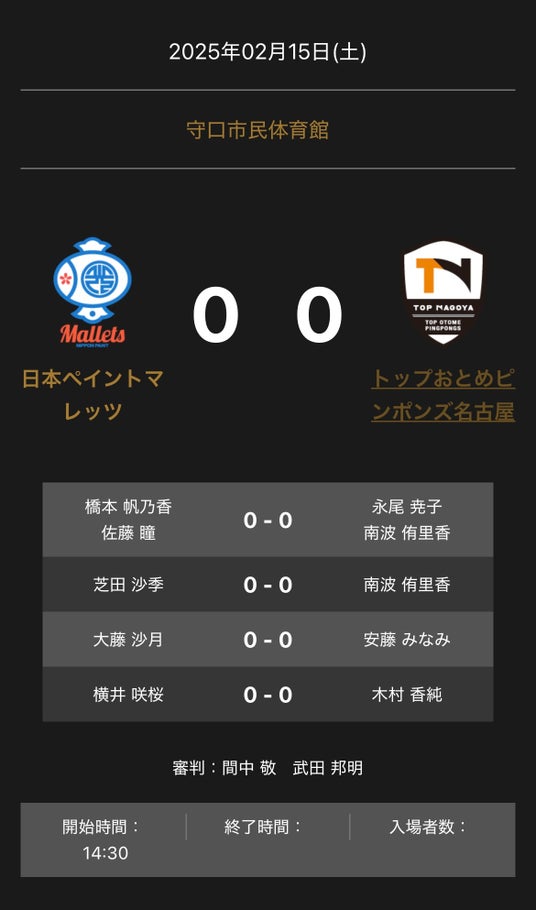 ノジマTリーグ 2024-2025シーズン 公式戦 2月15日開催 「日本ペイントマレッツ vs トップおとめピンポンズ名古屋」の対戦オーダーを発表いたします。