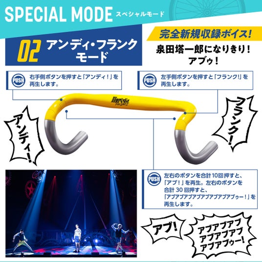~舞台の熱さを感じられる2つのモードを搭載~舞台『弱虫ペダル』シリーズより、主人公『小野田坂道』らが劇中で使用するハンドルを、「ペダステハンドル」と名付け、キャストボイスやBGMを搭載して商品化いたします。本体の外観は、実際にキャストが舞台で使用しているドロップハンドルを参考に、全長約370mmで立体化。
