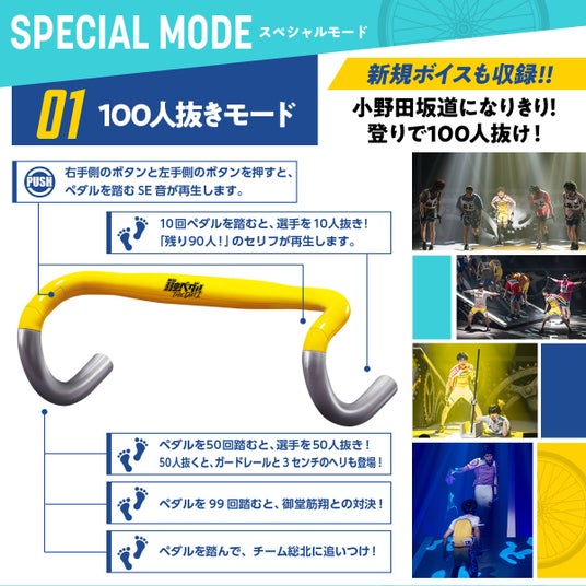 本体カラーは、小野田坂道ver. 巻島裕介ver. 東堂尽八ver. 真波山岳ver.の4種類です。ハンドル左右のグリップ部分にはボタンを搭載しており、ボタンを押すことで音声やBGMが発動し、舞台『弱虫ペダル』の熱さを感じながら遊ぶことが可能です。本商品には、舞台『弱虫ペダル』の熱さを感じられる【セリフモード】【スペシャルモード】2つのモードを搭載。