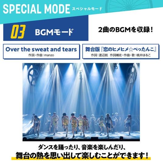 田所・鳴子vs泉田のスプリンター争いや、巻島vs東堂のラストクライム、エースたちの三つ巴対決など、印象的なシーンのセリフが再生されます。スペシャルモードには、【100人抜きモード】、【アンディ・フランクモード】、【BGMモード】の、舞台『弱虫ペダル』をイメージした遊びを搭載しております。