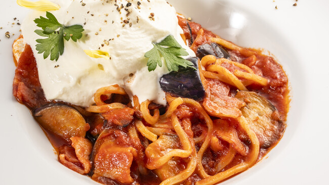 2.北海道産ベーコンと茄子のアラビアータ チーズをかけて