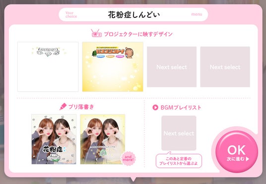 本機能では、選択テーマに合った「プロジェクターフォト」のデザイン・プリ落書きコンテンツ・BGM・シールデザインをまとめて提案。撮影中はもちろんプリを見返す時まで、その日のことを思い出せるような体験をお届けします。