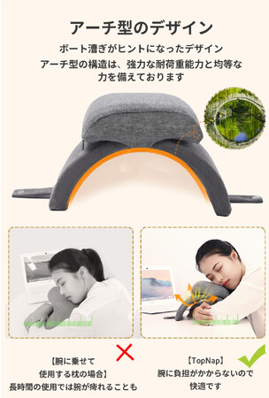 「TopNap(トップナップ)」は、長時間のお昼寝でも腕や顔が痛くならないよう、デザインを工夫した究極のポータブル安眠枕。