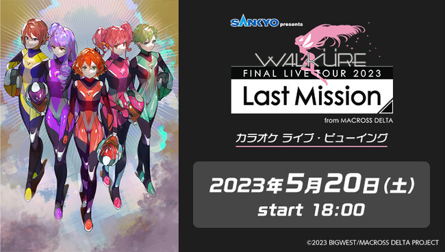 株式会社エクシングが展開する通信カラオケ「JOYSOUND」の、観て楽しめる多彩な映像コンテンツをお届けするサービス「みるハコ」で、TVアニメ『マクロスΔ』戦術音楽ユニット”ワルキューレ”のライブを生配信!東京有明アリーナで2日間にわたり開催される『ワルキューレ FINAL LIVE TOUR 2023 ~Last Mission~』の5月20日(土)公演の模様を、全国のカラオケ店舗にライブ・ビューイングします。本配信は、当日18時から、対象機種「JOYSOUND MAX GO」を導入の全国の対象カラオケルームでお楽しみいただけます。