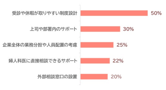 また、女性が健康課題を抱えながらキャリアを築くために必要なサポートは、「受診や休暇が取りやすい制度設計」「上司や部署内のサポート」「業務分担や人員配置の考慮」などが挙がっています。職場での女性活躍推進を目指す中で、職場環境の改善には、生理を含む女性の健康問題に対する周囲の理解が不可欠です。