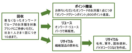 「オンワード・グリーン・キャンペーン」は、株式会社オンワード樫山が実施する取り組みで、お引き取りした衣料品から毛布や軍手を生産し、国内外の被災地や開発途上国への支援活動に活用するなど、環境・社会貢献活動に役立てています。そごう・西武各店の対象売場に、着なくなったオンワードグループのお洋服をお持ちいただくと、1点につき「オンワードグリーンポイント500ポイント」を進呈いたします。