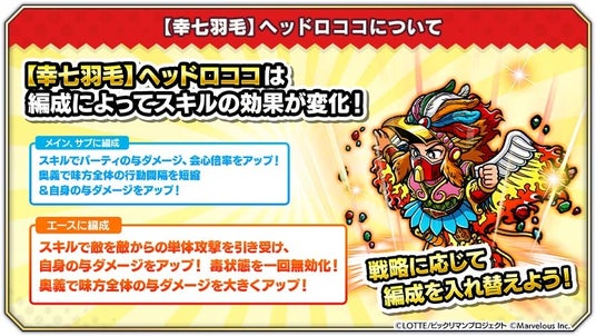 新たな☆3キャラクター「[幸七羽毛]ヘッドロココ」と、「[黒戒律伝道王]ダビデブ」と、☆2キャラクター「[七助]酔助」が登場する、「幸七羽毛と邪媚按ガチャ」を開始いたしました。