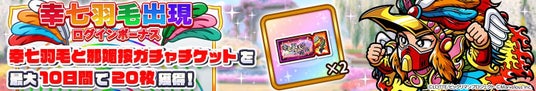 本メンテナンス後より、ログインした際に「幸七羽毛と邪媚按ガチャチケット」を2枚、最大10日間で20枚獲得(最大20連分)できる特別なログインボーナスを開始いたします。