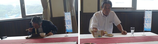 まずはうどんを試食。「良い味がでてますね~。ひらめっていったら高級感がありますからね。」そして思わず…「全部食べても良いの?」と確認すると、すぐに完食。続いてクッキーを頬張り「形がひらめですね。レモンの香りもして美味しいです。子どもたちにも是非食べてほしいですね。」と感想をいただきました。