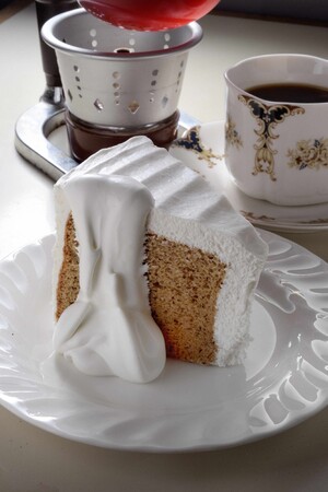開業時から続く名店『アロマ珈琲』(東京「ヤエチカ」)の「ケーキセットの珈琲と紅茶シフォン」850円。自家焙煎した豆を使い、香り豊かな一杯を提供する。