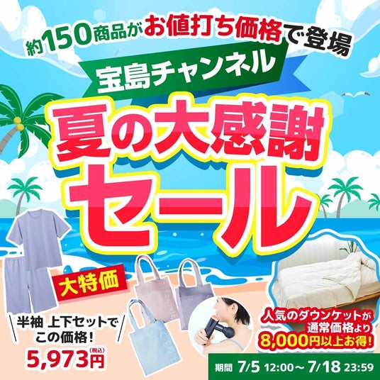 ファッション誌販売部数トップシェア(※)の株式会社宝島社(本社:東京都千代田区、代表取締役社長:関川誠)の公式通販サイト「宝島チャンネル」は、2024年7月5日(金)12:00より夏の大感謝セールを開催。人気の疲労回復ウェアやキャラクターグッズ、ブランドムック、お部屋ライト、コスメパレットなど約150種類の商品を最大50%オフで販売。対象商品は開催期間中、随時追加いたします。