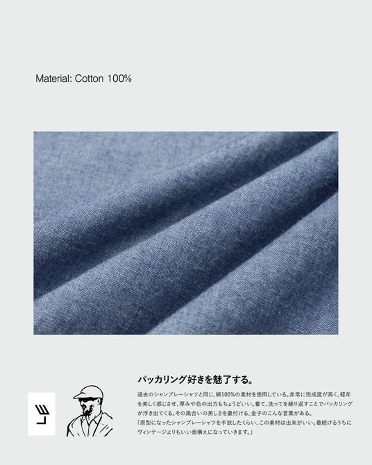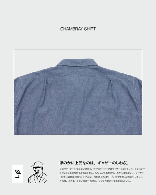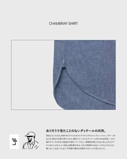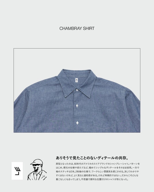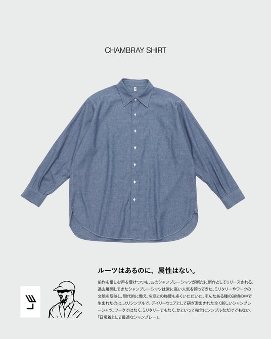 前作を惜しむ声を受けつつも、LEのシャンブレーシャツが新たに新作としてリリースされる。過去展開してきたシャンブレーシャツは常に高い人気を誇ってきた。ミリタリーやワークの文脈を反映し、現代的に整え、名品との称賛も多くいただいた。そんなある種の逆境の中で生まれたのは、よりシンプルで、デイリーウェアとして研ぎ澄まされた全く新しいシャンブレーシャツ。ワークではなく、ミリタリーでもなく、かといって完全にシンプルなだけでもない。「日常着として最適なシャンブレー」。