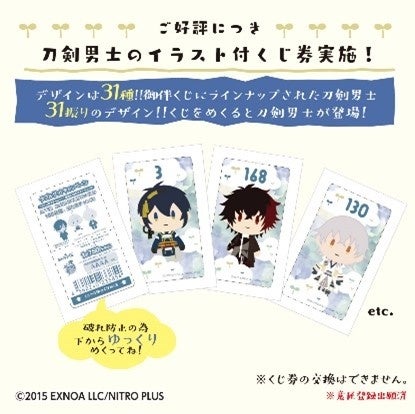 めくって楽しい!貰って嬉しい!「イラスト付くじ券」全31種類のデザイン、総勢三十一振りの刀剣男士がランダムで登場する「イラスト付くじ券」を前作に続いて採用。くじをめくった後は店舗ひきとり券部分を切り離し、キャラクターがプリントされているくじ券もお持ち帰りいただけます。是非お楽しみください。