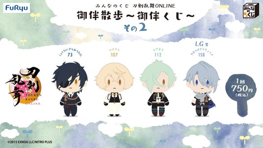 フリュー株式会社(本社:東京都渋谷区、代表取締役社長:三嶋 隆、以下フリュー)は、PCブラウザ・スマホアプリゲーム「刀剣乱舞ONLINE」よりスマホアプリ内の「御伴散歩」で使用されているイラストを用いた、『みんなのくじ 刀剣乱舞ONLINE 御伴散歩 ~御伴くじ~ その2』を、10月12日(土)よりファミリーマート、ホビーショップ、書店、刀剣乱舞万屋本舗 渋谷本店/京都アバンティ支店などにて順次発売いたします。A~G賞、ラストゲット賞、ダブルゲット賞の全賞詳細を初公開いたします。