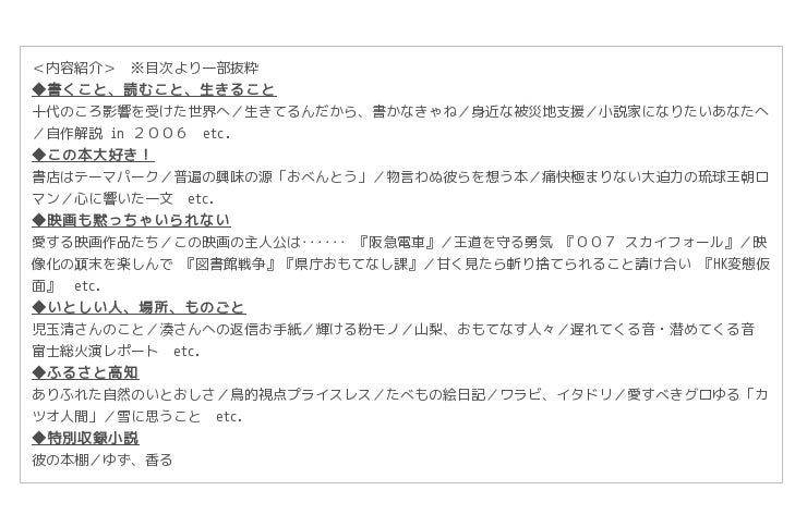 日々の生きるつれづれ、創作の裏側、大好きな本や映画のこと、「児玉清さんのこと」をはじめとした敬愛する人びとのこと、ふるさと高知のことなど、有川氏がデビュー書籍刊行以前から現在までに各紙誌に寄稿されたエッセイの中から94本を選出。さらに、執筆時を振り返るコメントをそれぞれに書き下ろし。