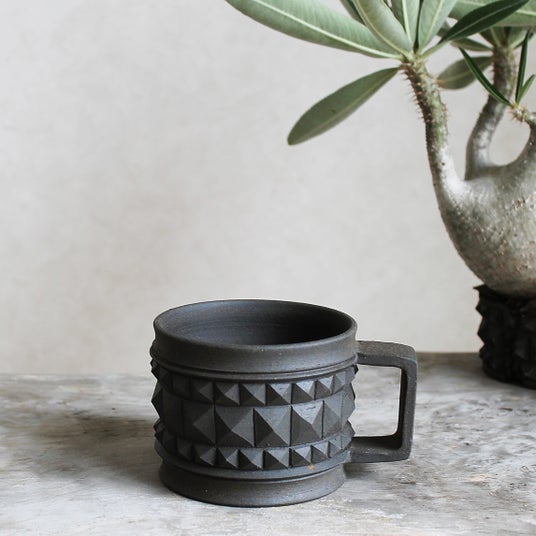 様々な人と情報、モノが交錯するTokyoを器に落とし込み、新しい価値観のモノづくりがコンセプト。アートのような存在感、かつ実用性のある器作りを心掛けている「吉光窯」。今回、1つずつ削り出して装飾している無釉の焼き締めスタッズマグなどが登場。