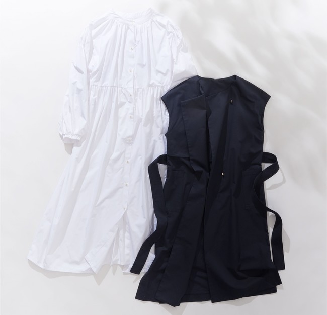 トレンチのようなディテールを活かしたジレ。前を閉じればワンピース風の着こなしに。