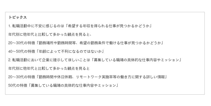 こうした不安を背景にしたように、企業に提示してほしい情報では、20~30代は「働き方に関する詳しい情報」、50代では「具体的な仕事内容やミッション」と年代別で差異が色濃く見られました。