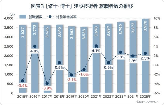 大学院(修士・博士)を修了し、建設技術者として新卒で就職した人数は、前年比2.5%増で、5年連続で増加しています。人数ベースでは3,970人と少ないものの、建設技術の高度化を背景に、より専門性の高い人材への需要が高まっていると考えられます。