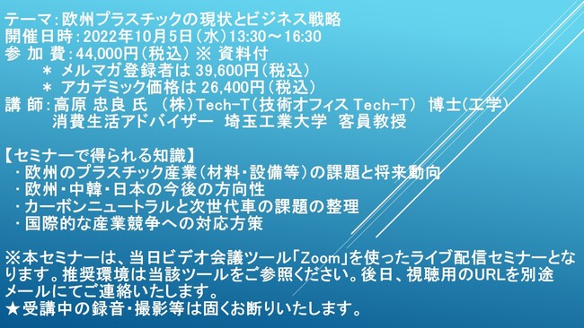 先端技術情報や市場情報を提供している(株)シーエムシー・リサーチ(千代田区神田錦町: https://cmcre.com/ )では、 各種材料・化学品などの市場動向・技術動向のセミナーや書籍発行を行っておりますが、 このたび「欧州プラスチックの現状とビジネス戦略」と題するセミナーを、 講師に高原 忠良 氏 (株)Tech-T(技術オフィス Tech-T) 博士(工学) 消費生活アドバイザー 埼玉工業大学 客員教授)をお迎えし、2022年10月5日(水)13:30より、 ZOOMを利用したライブ配信で開催いたします。 受講料は、 一般:44,000円(税込)、 弊社メルマガ会員:39,600円(税込)、 アカデミック価格は26,400円(税込)となっております(資料付)。