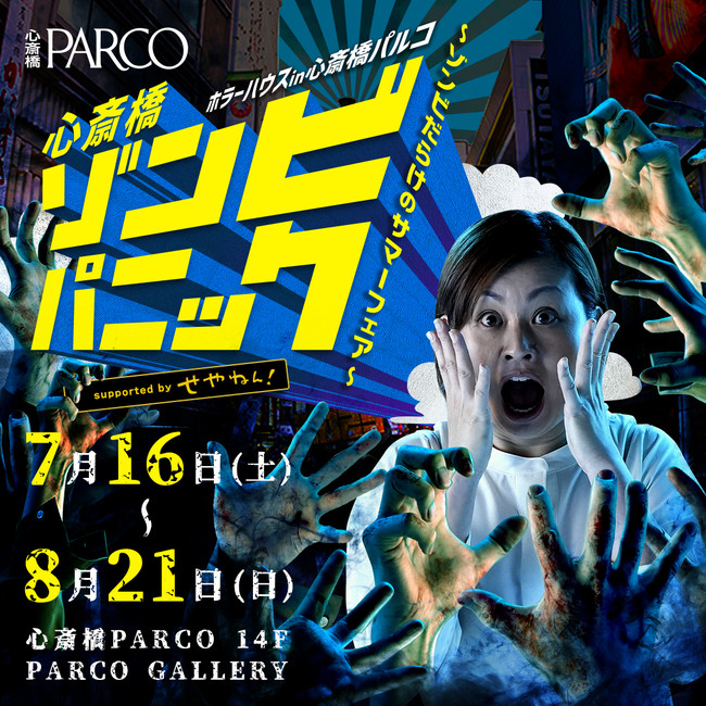2022年7月16日(土)~8月21日(日)の期間中、心斎橋PARCO 14F PARCO GALLERYにて、お化け屋敷プロデューサー五味弘文氏が手がけるお化け屋敷「ホラーハウス in 心斎橋PARCO 心斎橋ゾンビパニック~ゾンビだらけのサマーフェア~」を開催致します。ショッピングフロアに見立てた会場内で、襲い掛かるゾンビから逃げながらお目当ての服をゲットしゴールを目指す、スリル満点のミッション付きお化け屋敷!