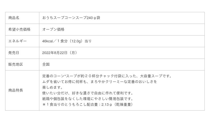 コロナ禍で生活スタイルや働き方が変化したことにより、ご家庭でスープを喫食するシーンや頻度が増加しています。「おうちスープ」は、大容量タイプの袋入りスープとして、昨年数量・期間限定で販売しました。