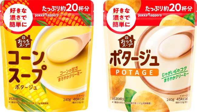 サッポロホールディングス(株)のグループ企業である、ポッカサッポロフード&ビバレッジ株式会社(代表取締役社長:征矢真一、本社:愛知県名古屋市)は、新シリーズの「おうちスープコーンスープ240g袋」「おうちスープポタージュ240g袋」を2022年8月22日(月)より、全国で新発売します。