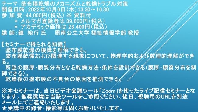 先端技術情報や市場情報を提供している(株)シーエムシー・リサーチ(千代田区神田錦町: https://cmcre.com/ )では、 各種材料・化学品などの市場動向・技術動向のセミナーや書籍発行を行っておりますが、 このたび「塗布膜乾燥のメカニズムと乾燥トラブル対策」と題するセミナーを、 講師に鏡 裕行 氏 周南公立大学 福祉情報学部 教授)をお迎えし、2022年10月6日(木)13:30より、 ZOOMを利用したライブ配信で開催いたします。 受講料は、 一般:44,000円(税込)、 弊社メルマガ会員:39,600円(税込)、 アカデミック価格は26,400円(税込)となっております(資料付)。