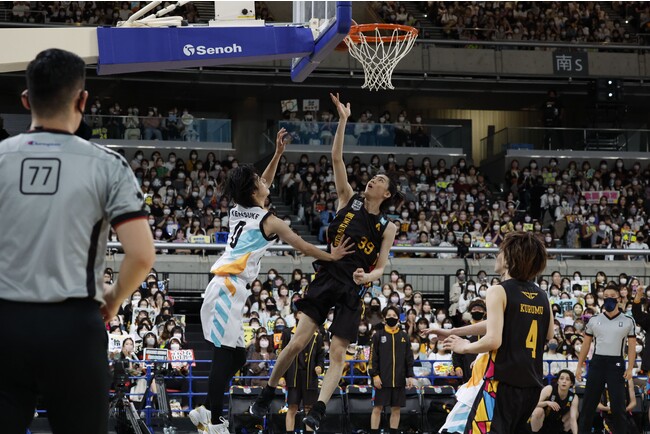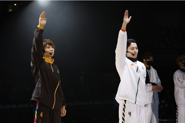 ハーフタイムショーでは、高野率いる俳優たちによる光るボールを取り入れた幻想的でキレキレなパフォーマンスと、丘山とサプライズで登場した鳥越裕貴らは自身のユニット「WINWIN」の曲を披露してのパフォーマンスで会場を沸かせ、後半戦に突入。3rdクォーターが終わったところで36対26とDREAM CATERPILLARSがリードを広げたところで、救済企画とも言える“各チームのヘッドコーチによるフリースロー5番勝負”が行われた。通常のフリースローサークルからのシュートは1点、3ポイントラインからのフリースローは3点、さらに10点が加算されるコート中央のセンターサークルからのロングシュートの中から選んで5本シュートするというルール。DREAM CATERPILLARSの岸 祐二が3ポイントシュートを決めたものの、SPARK SEEDSの荒木健太朗がロングシュートを決めて10点をゲット。「39対36」の3点差で4thクォーターが始まった。残り3分26秒で「48対48」の同点となり、その後も両チームが点を加え、最終結果は55対56でSPARK SEEDSが見事な逆転勝利を収めた。