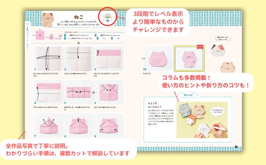 手順のページは、丁寧な説明と写真でちょっとでも難しい部分と思う部分をフォローできるように工夫しています。また、作品の制作は3段階のレベルで難易度を分けました。5歳くらいから親子で一緒に、小学生のお子さんなら一人でも次々と折り進めることができる難易度になっています。