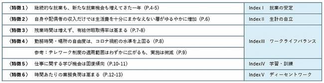 ・2022年は、コロナ禍を経て働き方が再び前進した一年となった。IndexI就業の安定とIndexIIIワークライフバランスはともに上昇し、コロナ禍前(2019年以前)の水準をも上回っている。就業の安定性が高く、適切な労働時間で休暇取得も可能な働き方の実現に向けて一歩進んだ。