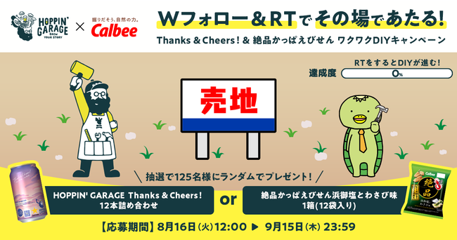 「HOPPIN’ GARAGE Thanks & Cheers!」の発売にあたり、「がんに関する企業内ピアサポーターの育成」という志を同じくするカルビーと合同でTwitterキャンペーンを実施します。HOPPIN’ GARAGEとかっぱえびせんブランドから、楽しいお酒時間をお届けできる賞品をご用意しました。