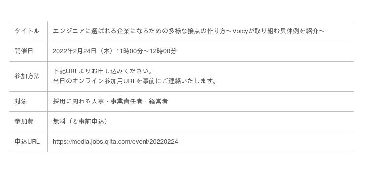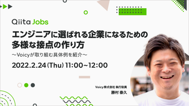 株式会社エイチームのグループ会社であるQiita株式会社(本社:名古屋市中村区、代表取締役社長:柴田健介)は、オンラインセミナー「エンジニアに選ばれる企業になるための多様な接点の作り方~Voicyが取り組む具体例を紹介~」を2022年2月24日(木)に開催します。
