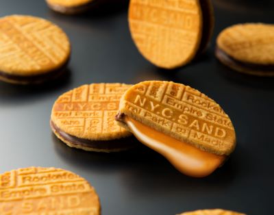 看板商品の「N.Y.キャラメルサンド」は口どけのよいクーベルチュールチョコレートで、生クリームと黒糖をとろとろに炊き上げたキャラメルを包み込み、オリジナルの焼印をつけたバターたっぷりの香ばしいクッキーでサンドしています。