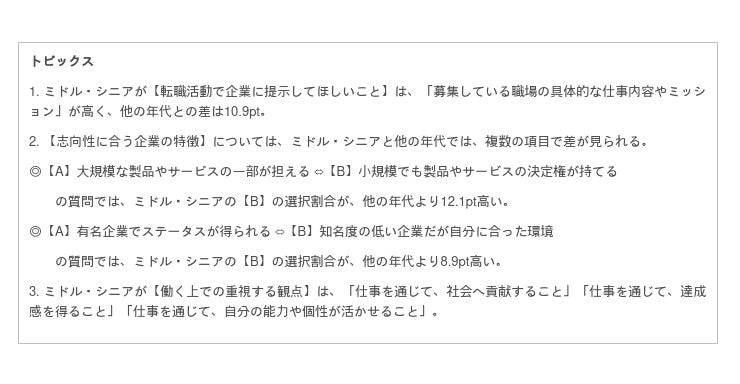 調査から見えてきたのは、ミドル・シニア転職活動者の、他の年代にはない、企業選びや働く志向です。「知名度より決定権」「ステータスより自分の能力が活かせる環境」「仕事を通じた社会貢献を重視」など、実質的な項目が浮かび上がりました。そこには、世の中でいうところのネガティブなイメージ(働かないミドル・シニア、ぶらさがり)とは一線を画す、前向きな立ち姿が見えてきます。これまで培ったスキルや経験を社会に還元したいと望むミドル・シニアに、解像度の高い活躍・貢献のステージを提示できる企業は、知名度の高低と関係なく、前向きなミドル・シニア人材に対する求心力を手にすることができるでしょう。
