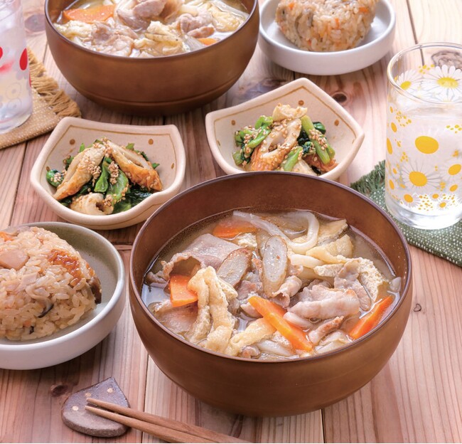 <1食1人分190円!>かしわめしのおにぎりと絶品♪ 豚汁煮込みうどん献立