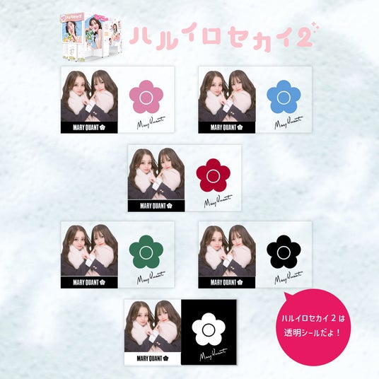 プリとデザインシールを組み合わせたシールレイアウト「クリアステッカー」に「マリークヮント」デザインが登場します。『ハルイロセカイ2』の透明なシール台紙「クリアシール」の特徴を活かした、カラフルなデイジーと「マリークヮント」のロゴが浮き上がるようなデザインが魅力。プリとデザインシール部分を切り離し、重ねてスマートフォンケースに挟むのも可愛くておすすめです。