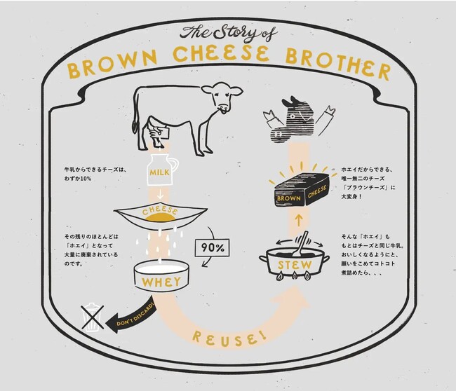 ホエイはチーズになる日を夢見て立ち上がり、ホエイにしかなれない「ブラウンチーズ」になりました。色はこんがりキャラメル色。味はほんのり甘ずっぱい。ホエイががんばってチーズになったこの「ブラウンチーズ」がより活用されていくことで、ミルクを余りなく使うことにつながり、チーズの兄弟もふたりとも活躍できることになるのです。みんなそれぞれ、何にだって価値がある。誰もが持つそれぞれの“ブラウン”は、いつかきっと実を結ぶはず。そうブラウンチーズが教えてくれているような、気持ちも豊かになるお菓子です。