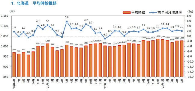 ■北海道の平均時給は1,028円(前年同月1,007円、前月1,027円)