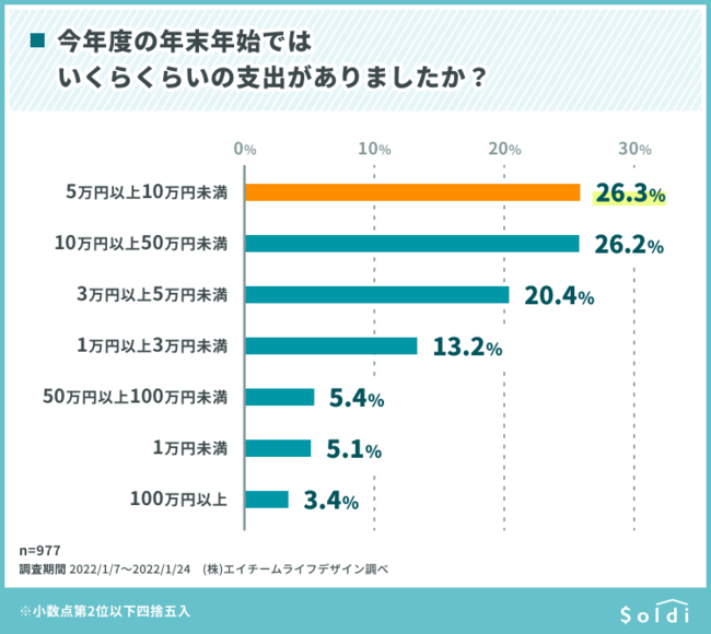 今年度の年末年始の支出額としては、「5万円以上~10万円未満」が26.3%、「10万円以上~50万円未満」が26.2%、「3万円以上~5万円未満」が20.4%となり、5~10万円の支出額が最も多かったという結果になりました。