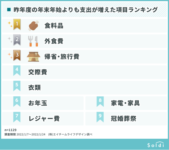 今回の調査結果から、2020年度の年末年始と比較して、55.7%の半数以上人が、2021年度の年末年始は支出が増えたと感じている一方で、わずか13.7%の人が支出は減ったと回答したことがわかりました。また、昨年度よりも支出が増えた項目としては、1位「食料品」、2位「外食費」、3位「帰省・旅行費」という結果になりました。