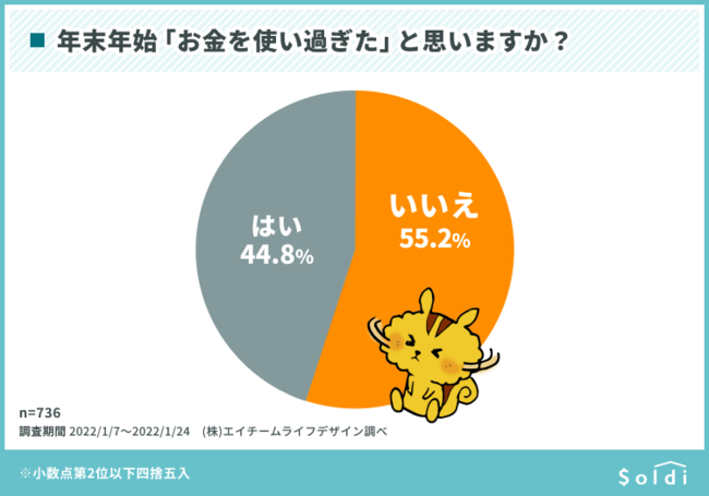 「今年度の年末年始にお金を使い過ぎたと思いますか?」という質問に対し、「はい」と回答した人が44.8%、「いいえ」が55.2%となり、ほぼ半々の結果になりました。