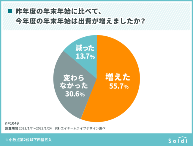 昨年度の年末年始と、今年度の年末年始の出費を比較したところ、55.7%の人が「昨年度よりも年末年始の出費が増えたと感じる」と回答しました。新型コロナウイルス感染症の新規感染者数が一時的に落ち着いた年末に、様々なシーンでお金を使ったようです。