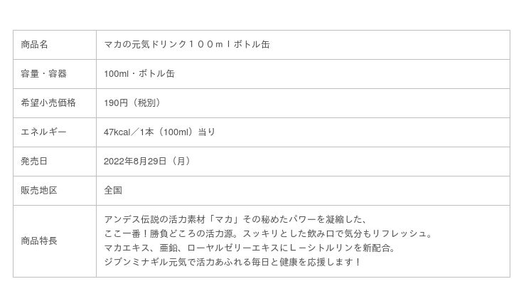 サッポロホールディングス(株)のグループ企業である、ポッカサッポロフード&ビバレッジ株式会社(代表取締役社長:征矢真一、本社:愛知県名古屋市)は、植物性活力素材「マカ」エキスを配合したドリンク、「マカの元気ドリンク100mlボトル缶」を2022年8月29日(月)より全国でリニューアル発売します。