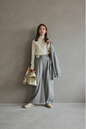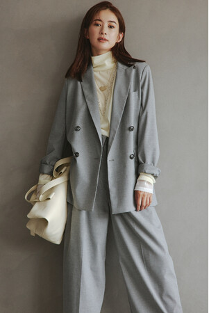 品のあるテーラードアイテムにスウェットやフリルを合わせた新鮮なスタイル。