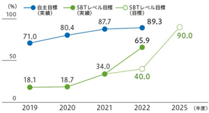 2022年度のアンケート調査では、主要サプライヤー214社(※2)のうち温室効果ガス削減に向けた自主目標設定率は89.3%、「SBT」水準の目標設定率は65.9%となりました。