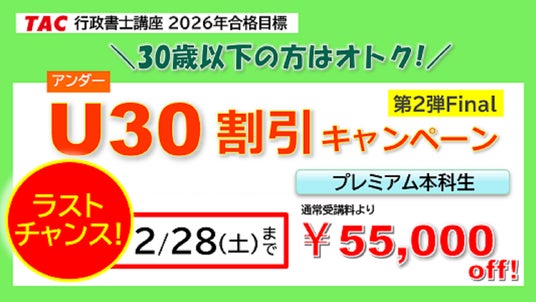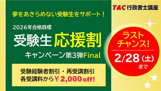 行政書士試験対策講座を展開しているTAC株式会社(東京都千代田区)は、今年度の行政書士試験の合格を目指せるコースが割引になる各種キャンペーンを2/28(土)まで実施中です。初学者の方も受験経験がある方もオトクに学習スタートできるチャンスです!