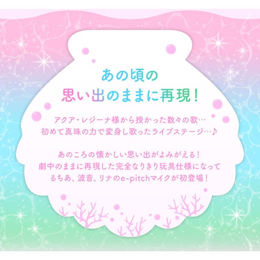 「e-pitchマイク 洞院リナ」には、リナのソロ曲「Star Jewel」とユニット曲「夢のその先へ」のフルバージョンを収録しています。敵を倒す際に歌われた曲が搭載されております。マーメイドプリンセスのライブステージを再現したなりきり遊びを楽しむことができ、当時の懐かしい思い出がよみがえる充実感のある内容となっています。※本商品は、マイクとしての使用はできません。製品ページはこちら: