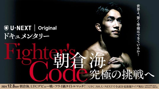 日本時間12月8日(日)開催の朝倉海UFCデビュー戦となる『UFC 310』。このたびU-NEXTでは朝倉海のUFC参戦までの日々に迫ったオリジナルドキュメンタリー『Fighter's Code~朝倉海 究極の挑戦へ~』を配信することが決定いたしました。